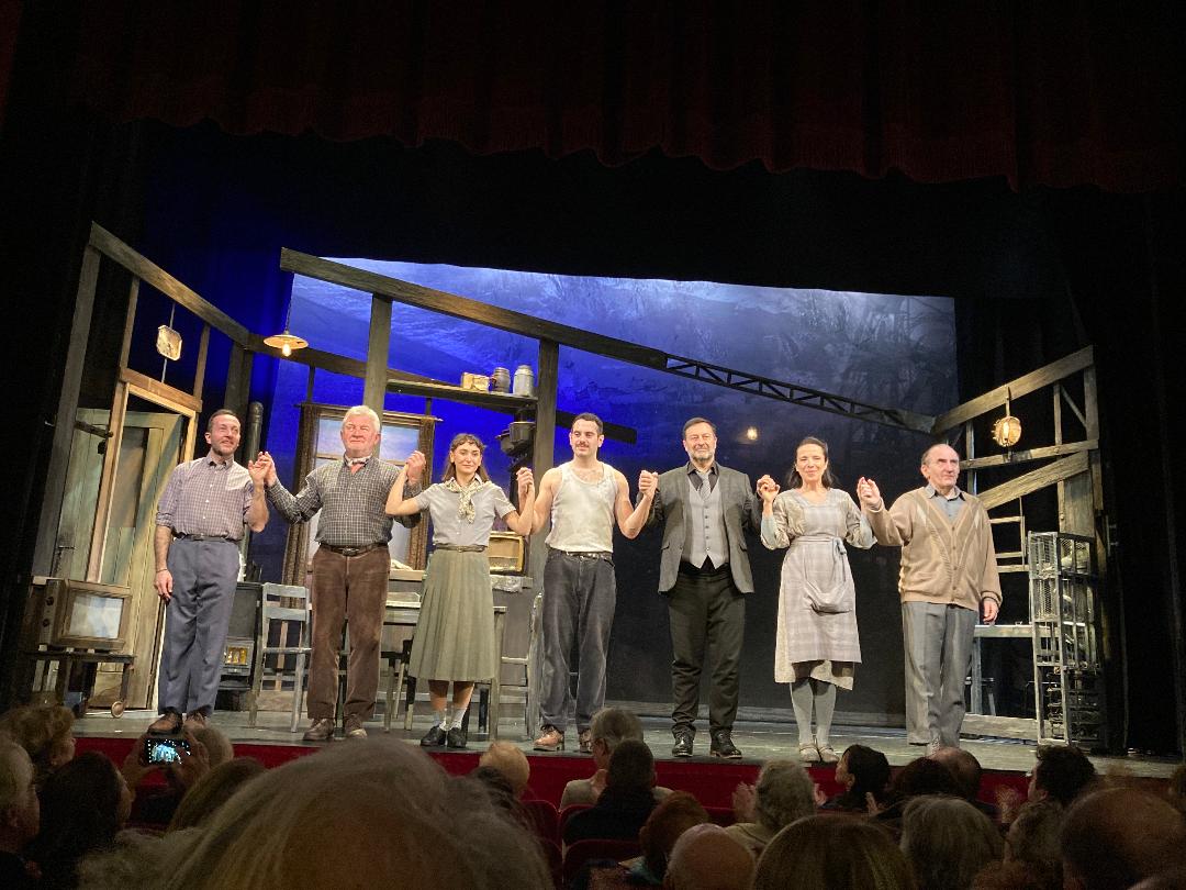 Aux saluts, devant une salle émue, de g. à dr. Julien Ratel, Aladin Reibel, Juliette Béhar, Théo Dusoulier, Jean-Philippe Daguerre (également auteur et metteur en scène), Raphaëlle Cambray, Jean-Jacques Vanier.