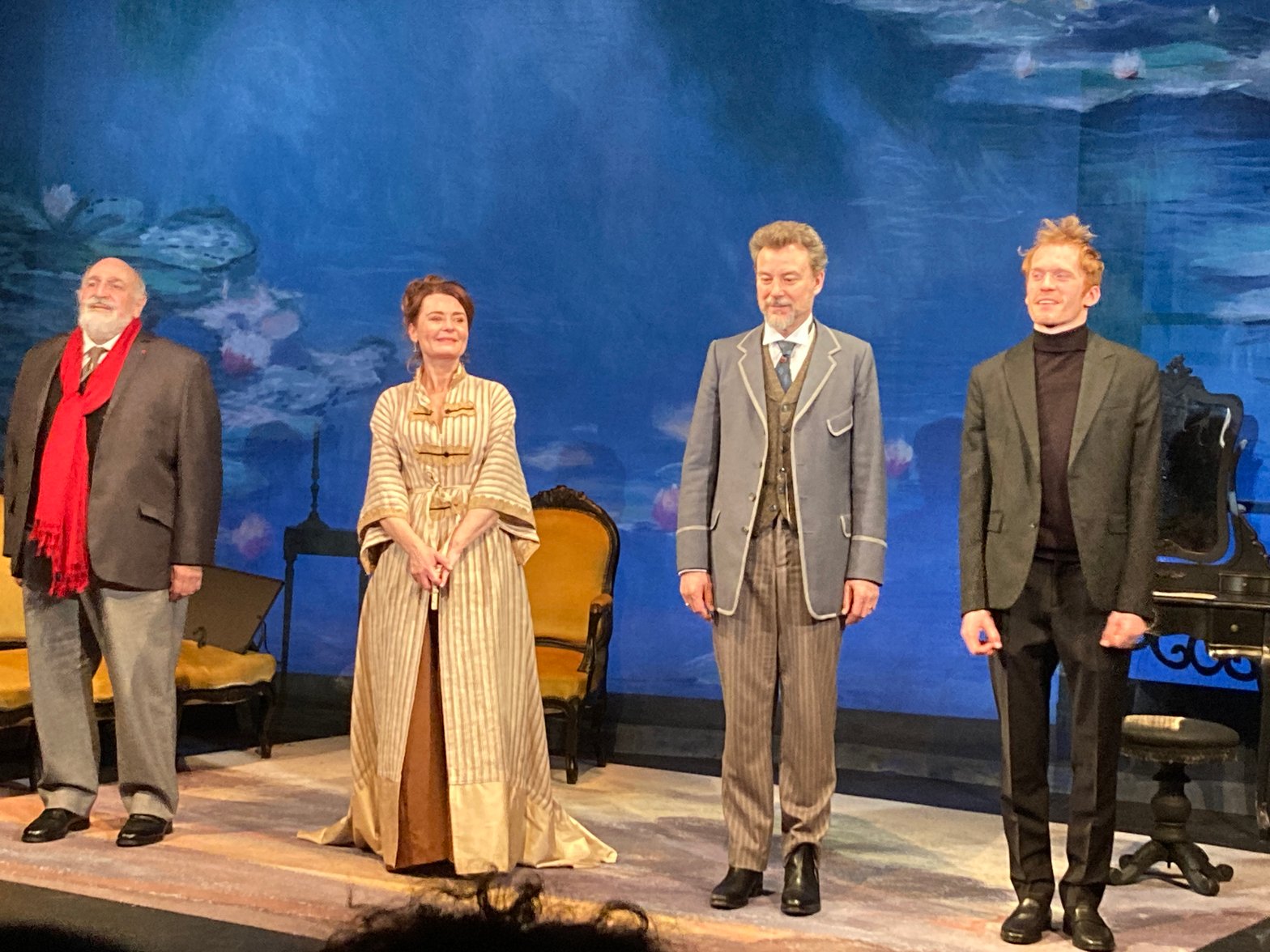 Aux saluts. De g. à dr. Frédéric Imberty joue un journaliste, Christelle Reboul (Madame Durand-Ruel), Christophe de Mareuil (Paul Durand-Ruel), Victor Bourigault (Auguste Renoir)