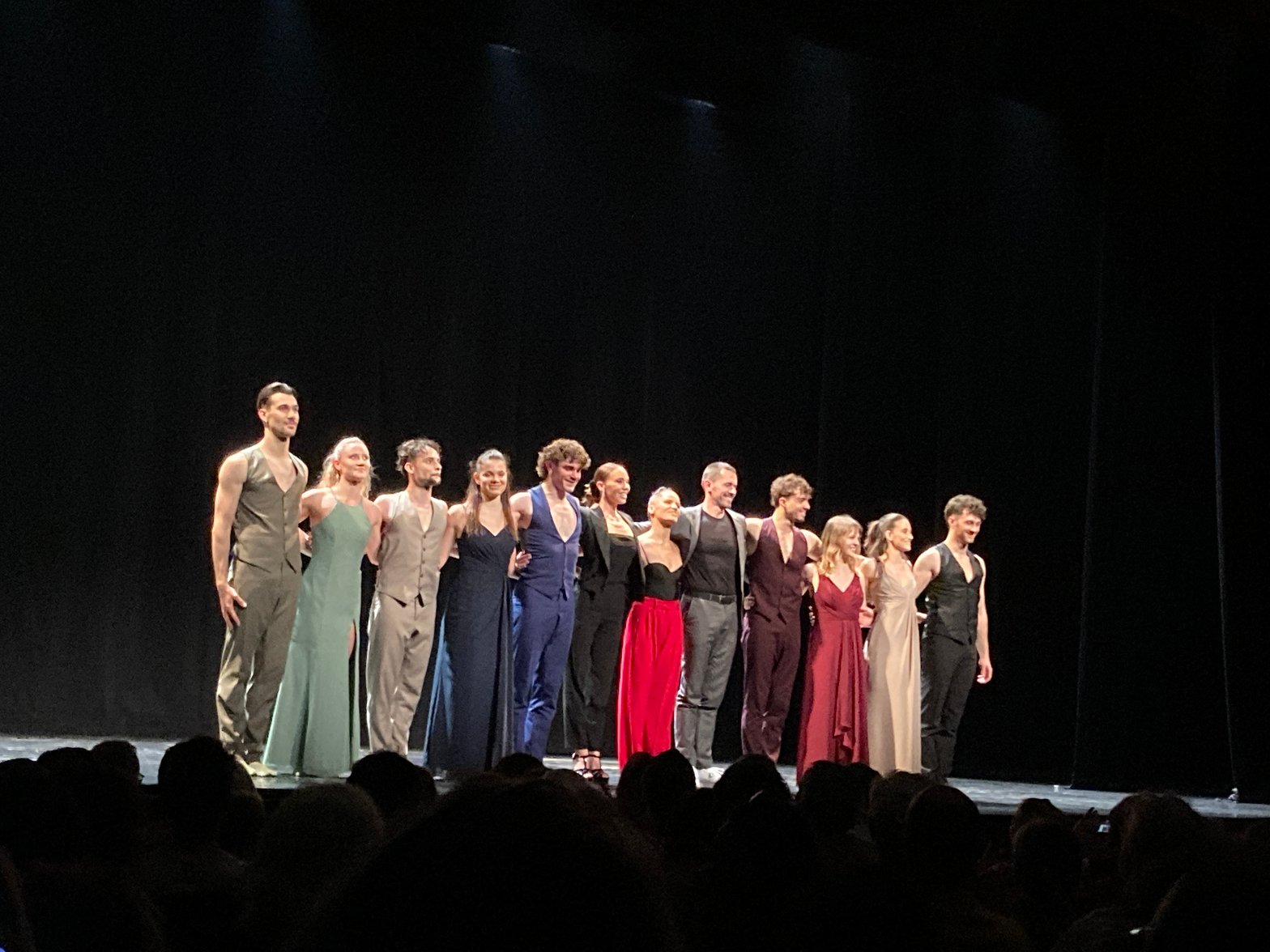 Les saluts lors de la générale, mercredi 9 avril à Paris. Lestel est en costume gris et Alexandra Cardinale en combi-pantalon noire. Carmen en pantalon rouge, “ses” 2 amoureux en marine et en rouille.